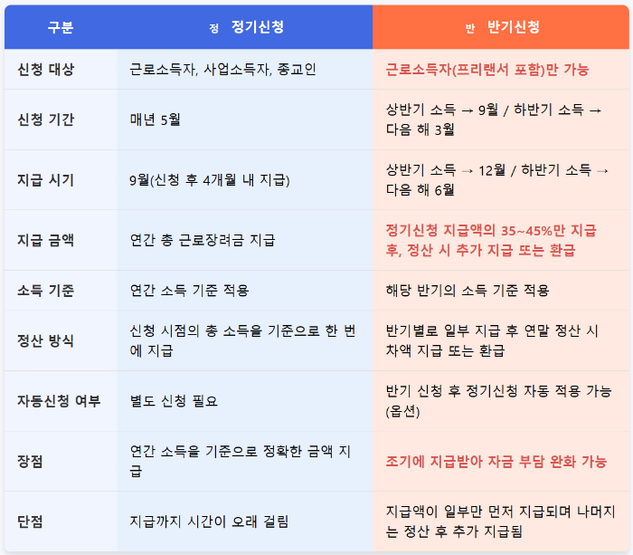 반기신청은 소득이 발생한 해당 반기에 지급되지만, 정기신청은 연 1회 지급됨 반기신청을 했다면 정기신청 시 추가 지급되거나 환급될 수도 있음