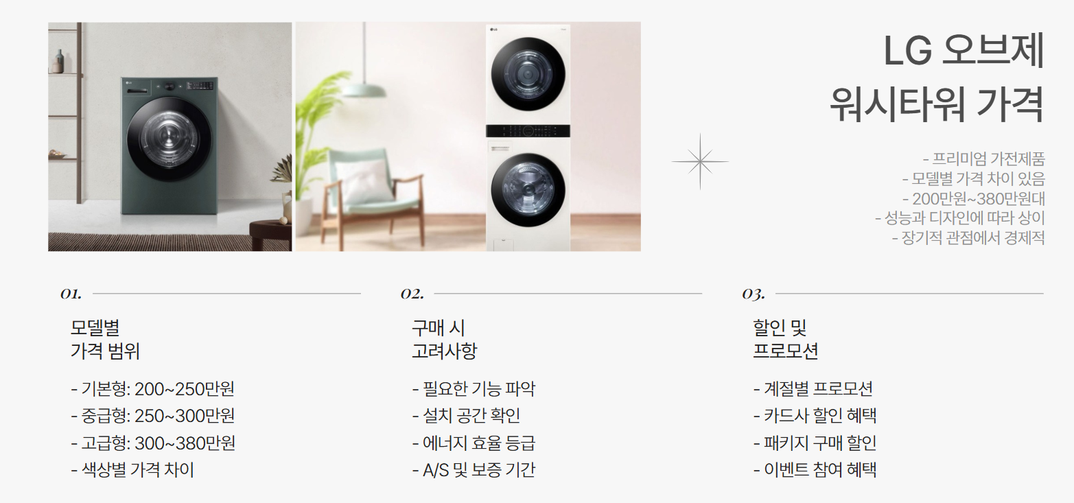아직도 건조기를 사야할 지, 저렴한 타사 제품을 사야할 지 고민하고 계신가요? 그 어떤 제품보다도 엘지 오브제 워시타워가 당신의 삶을 달라지게 할 것이라고 자신합니다. 워시타워를 한번 사용하면 다시는 건조기가 없는 생활로 돌아갈 수 없을 것입니다.
