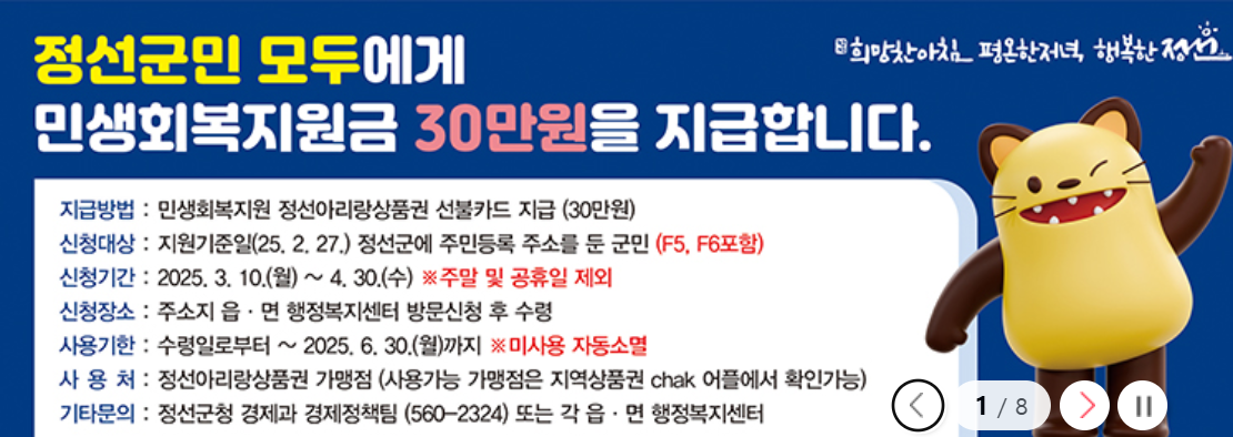 정선군에서 이런 군민과 소상공인을 위해 1인당 민생회복지원금 30만원을 준다고 합니다.