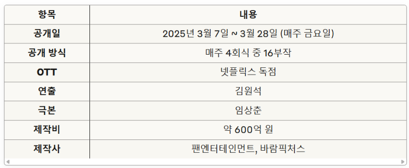 넷플릭스 최초로 주 단위 순차 공개 방식을 택하며 실험적인 시도까지 담아낸 작품입니다.