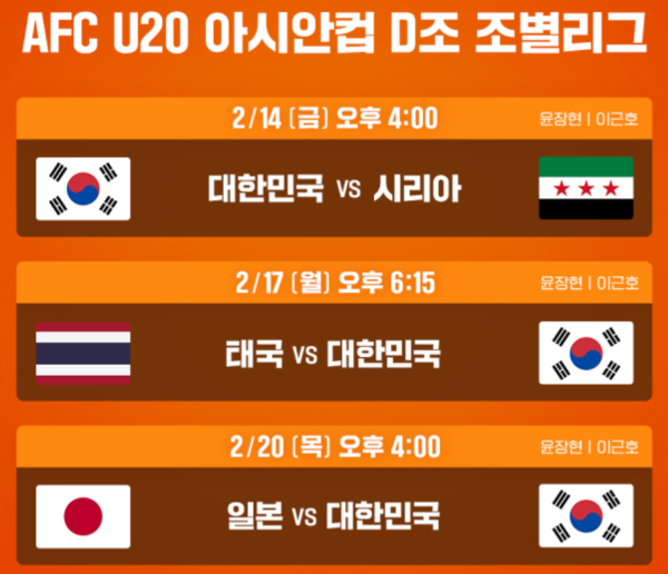 대한민국은 D조에 편성되어 시리아, 태국, 일본과 조별리그를 치르게 됩니다. 특히 2월 20일 일본과의 경기에 많은 축구 팬의들의 관심을 모으고 있습니다.