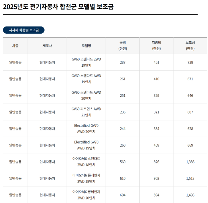 2025년 합천군 전기차 보조금을 승용차 1490만 원, 화물차 2470만원 까지 지원한다고 합니다.