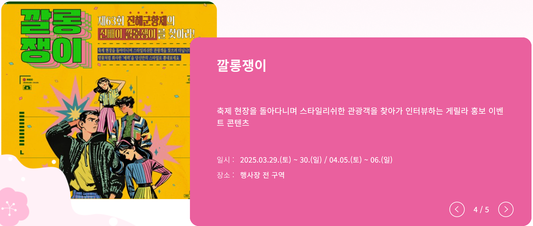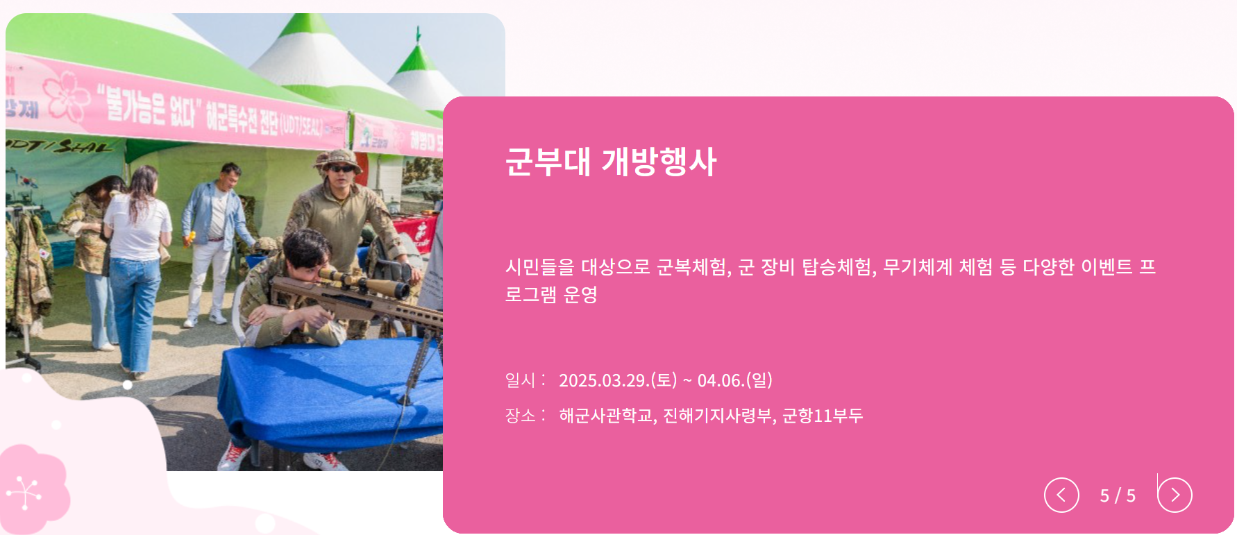 진해군항제는 벚꽃과 다양한 축제 프로그램, 특별한 체험행사까지 더해져 2025년 봄을 잊지못할 해로 만들어줄 것입니다. 진해군항제에서 벚꽃과 함께 행복한 추억을 남겨보세요!