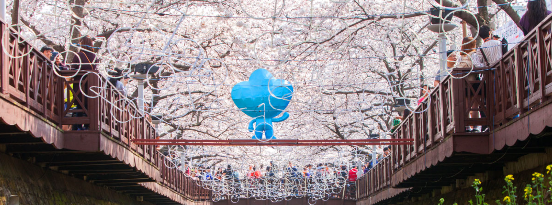 드라마 촬영지로 유명한 여좌천 로망스 다리는 벚꽃이 만개하면 핑크빛 터널이 생겨납니다.