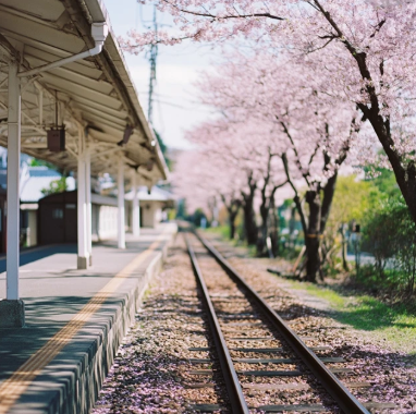 기차 선로와 벚꽃이 어우러져 동화 같은 장면을 연출합니다.