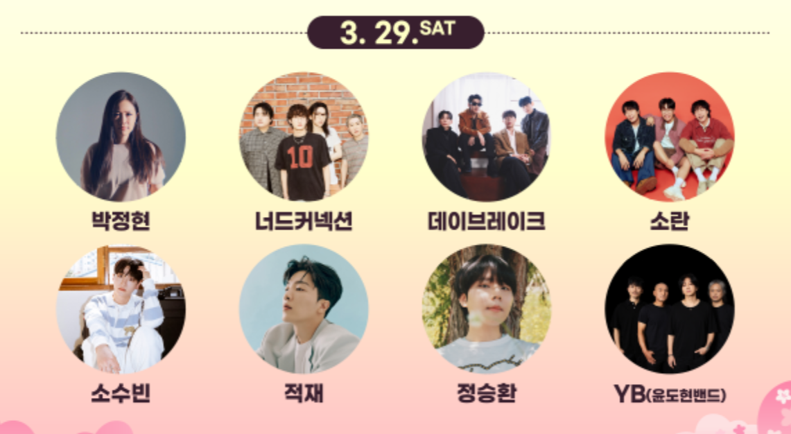 박정현, 적재, 정승환, YB, 10CM, 거미, 이무진, 이창섭, 허용별, 황가람, FT아일랜드 등 인기 가수들의 라이브 공연이 이어지며, 밤하늘을 수놓는 벚꽃과 음악의 환상적인 콜라보를 즐길 수 있습니다.